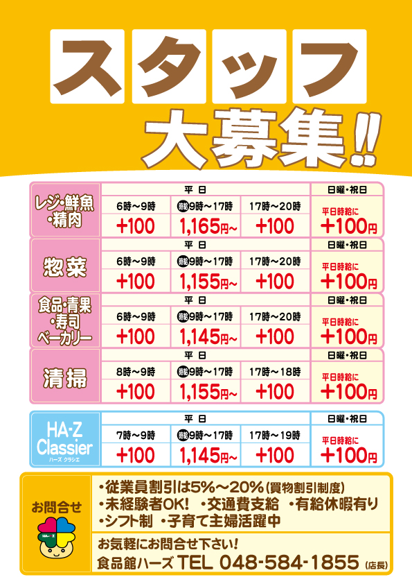 応募受付は、「食品館ハーズ 採用係」(048-584-1855)まで。